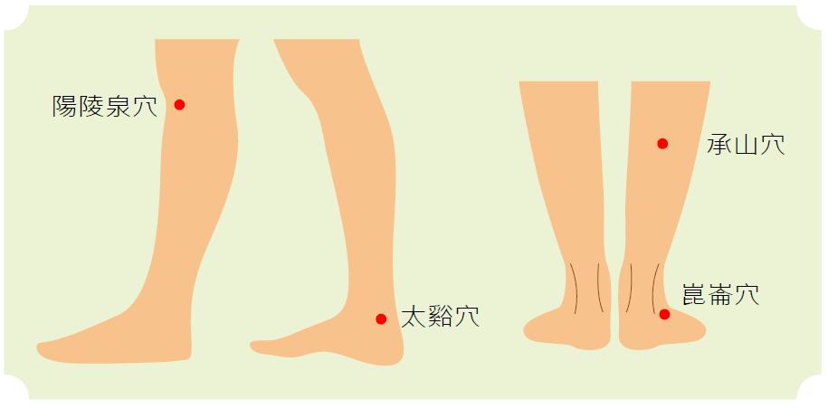 按壓承山穴、陽陵泉穴、太谿穴、崑崙穴等四個穴位,可以有助於來緩解疼痛。