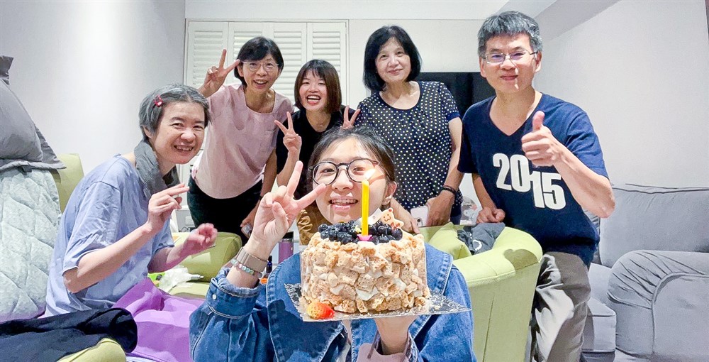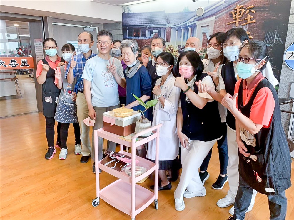 大林慈濟醫院住宿長照機構「輕安居」助里民與家人身心靈健康。圖為小姿與家人在輕安居慶祝新生。