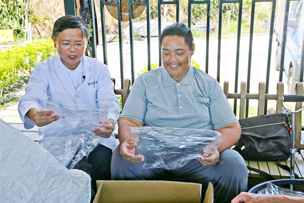 原本體重一百六十五公斤的李先生,在台北慈濟醫院醫護協助下翻轉人生,反哺社會。圖為李先生與徐榮源副院長一起在環保站做志工。攝影/王占籬