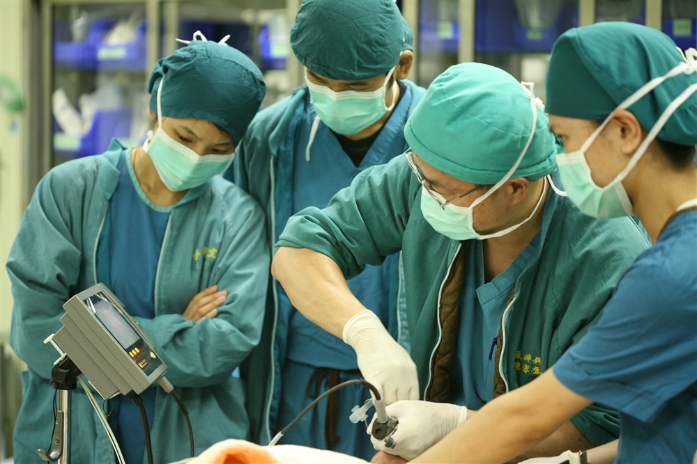 陳宗鷹(右二)臨床教學,教導學生如何使用內視鏡插管。
