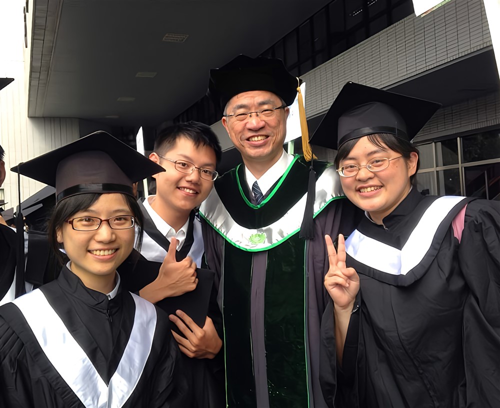 慈濟大學醫學院院長陳宗鷹(右二)深受學生喜愛,圖為與醫學系畢業生合影。