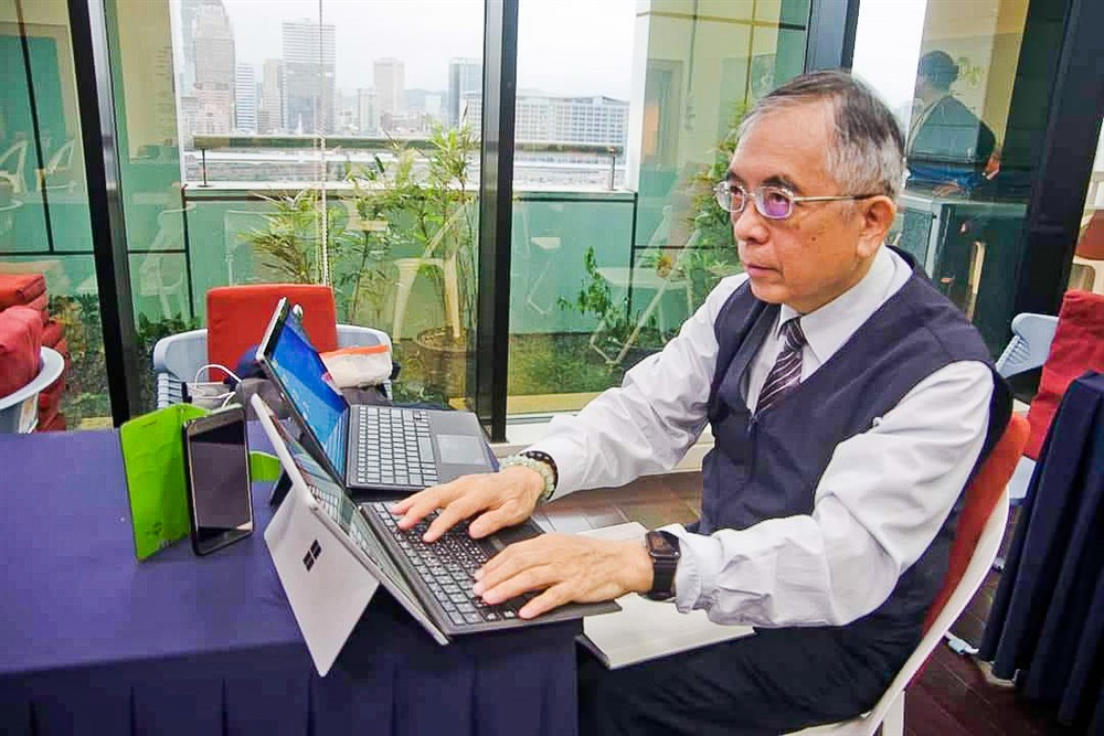 疫情期間,在慈濟松山聯絡處舉行線上品書會共修佛法,游師兄身兼主持、音控、記錄,多機作業一人搞定。圖/游永春提供