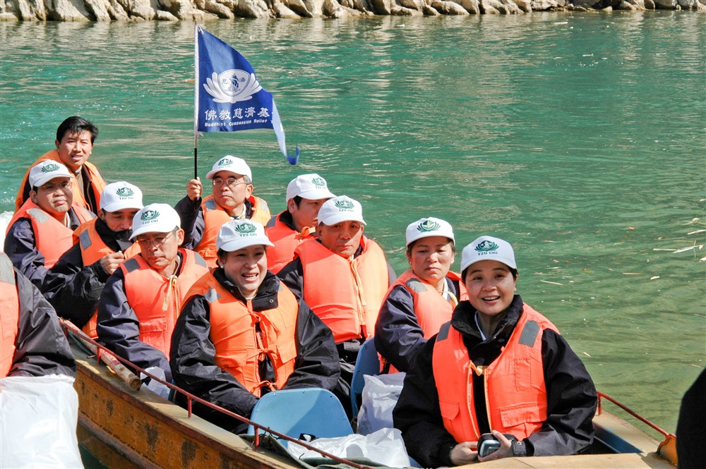 二○○五年貴州省扶困計畫暨紫雲縣冬令發放活動,大林慈院游永春副院長(掌旗者)隨慈濟隊伍搭船前往位於格凸河中游的大河苗寨進行訪視關懷。攝影/蔡淑婉