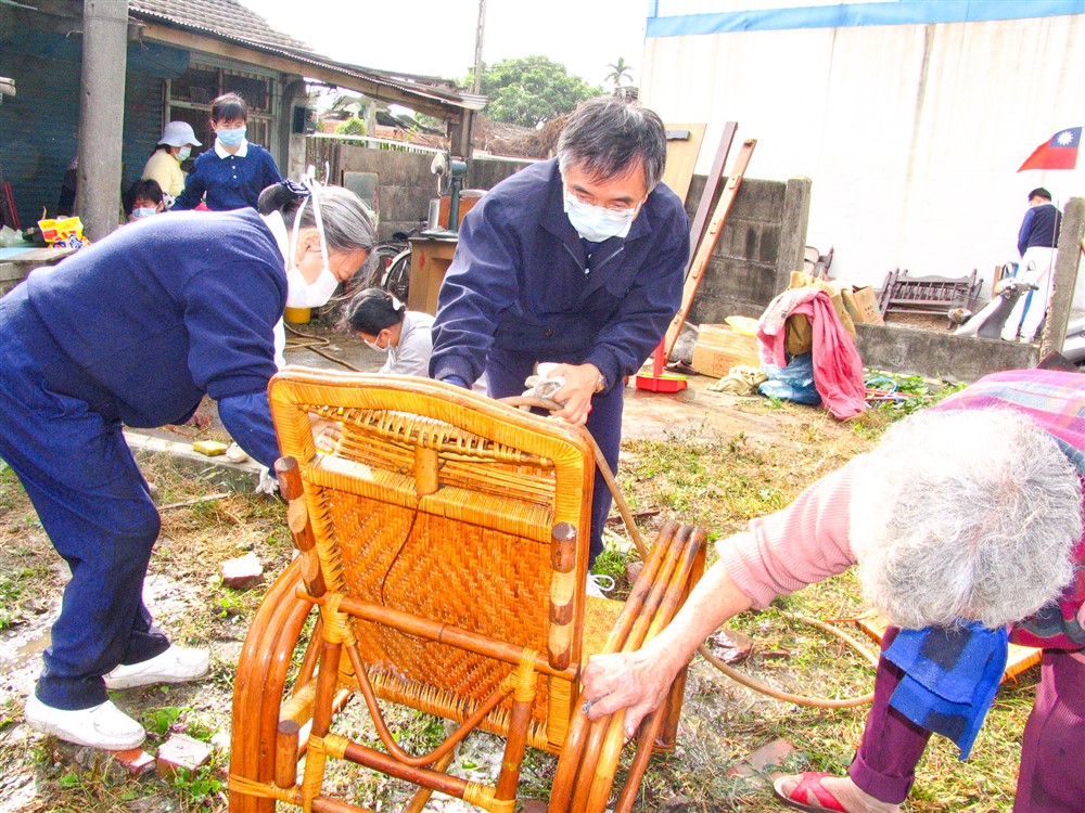 游永春與大林慈院同仁齊為慈濟關懷戶打掃家園,夫人楊苑苑師姊(左)同心付出。攝影/何姿儀