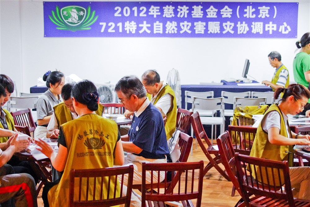 二○一二年北京暴雨成災,游永春顧問(中,穿藍天白雲志工服者)公餘前往慈濟救災協調中心服務,與志工們一同準備賑災物資。攝影/丁敏豔
