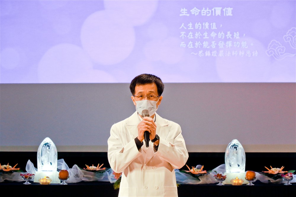 院長簡守信率副院長及耳鼻喉部醫師、護理同仁、吳主任家人敬獻燈燭、花香及素果,禮敬諸佛菩薩,並將功德回向吳主任。上人開示影片傳達生死觀,自然法則都在生老病死,生就是死的開頭,死就是生的起點,最重要的是從生到死過程中間的人生,如果可以透徹生命價值,有朝一日在生死關頭就能安心。