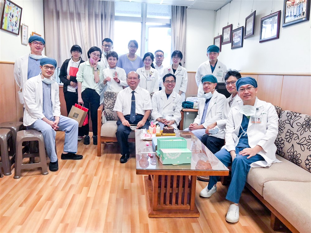 台中慈院耳鼻喉部科會,周一帆副主任(右三坐者)感謝老師吳弘斌的嚴格又有大度量。圖/謝承祐提供