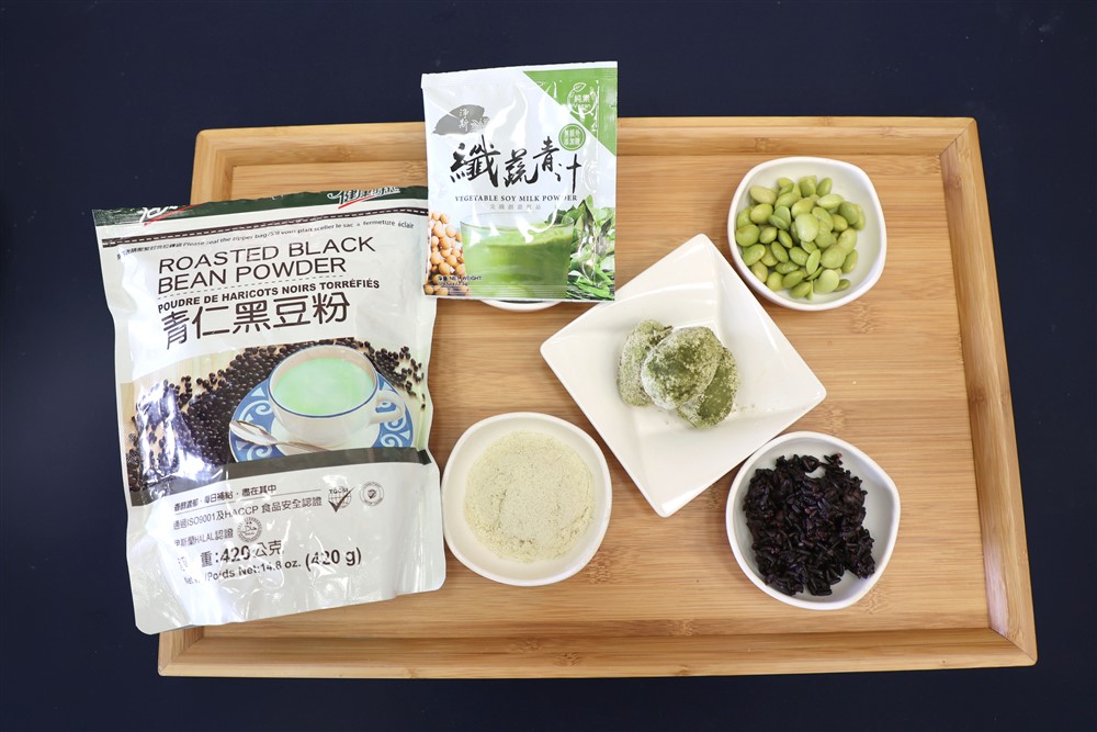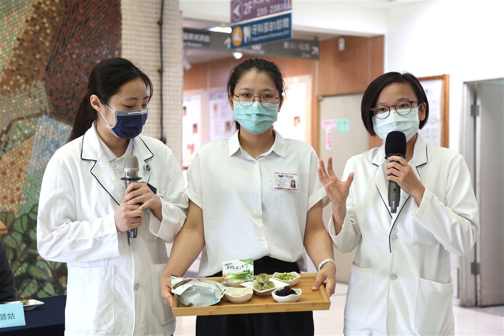 參與食譜設計的營養師團隊現場製作「綠牡丹萩餅」分享品嘗。營養師蘇真瑩(右)與陳珮瑄(左)指出,這是一道以黑糯米、毛豆仁為主要材料,靜思鮮蔬青汁粉、青仁黑豆粉做調味的點心,穀類和豆類混和吃,可以相互補充二者缺乏的氨基酸,吃進後能有效利用來製造蛋白質,健康無負擔。