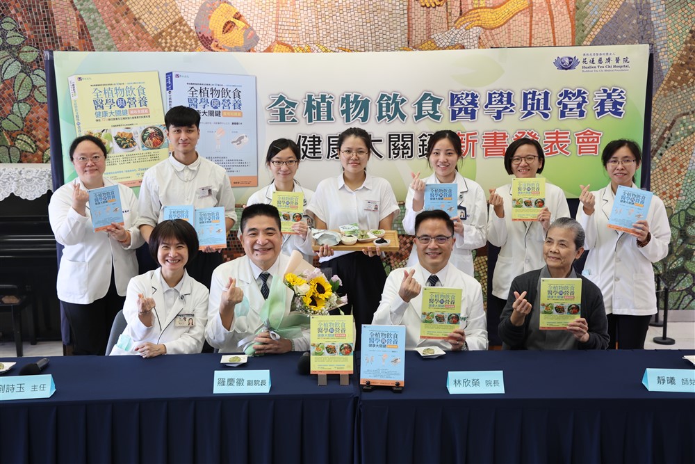 花蓮慈濟醫院副院長羅慶徽與營養科團隊,合作推出《全植物飲食醫學與營養健康大關鍵》「實用知識篇」、「美味食譜篇」套書。前排左起為營養科劉詩玉主任、羅慶徽副院長、林欣榮院長、常住志工顏靜曦師姊。