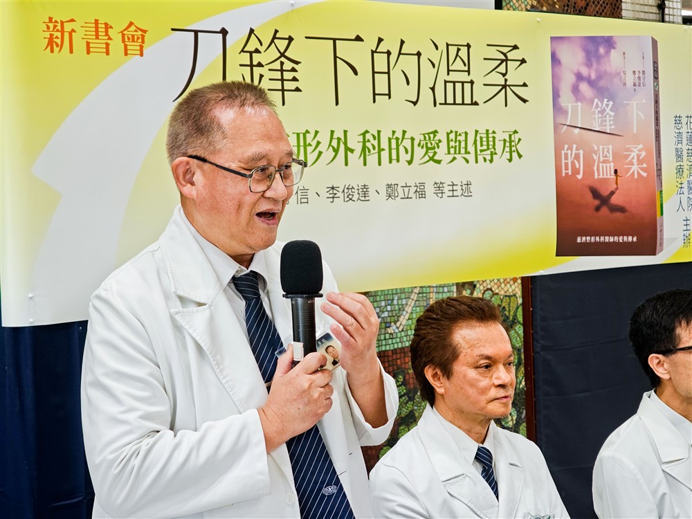 慈濟醫療法人林俊龍執行長表示,「慈濟基金會明年即將迎來六十周年,花蓮慈濟醫院也即將迎來四十周年,當年招募醫師非常困難,整形外科更為稀缺,今天看到有好多位服務超過三十年的醫師,包括簡守信院長、陳培榕副院長、李俊達主任、鄭立福醫師等,心中無比感恩。」早年東部許多民眾有吸菸、喝酒、嚼檳榔的習慣,因此口腔癌及頭頸癌的發生率極高,端賴耳鼻喉科團隊摘除腫瘤,整形外科團隊接手後續重建,「在這兩科緊密合作下,我們的頭頸癌病人五年存活率在臺灣、甚至世界上都名列前茅。而《刀鋒下的溫柔》這本書,珍貴地記錄整形外科這段艱辛的專業堅持與傳承,更是慈濟醫療志業的光榮。」