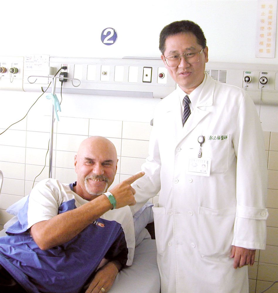 暖心又慈悲的鄭立福醫師(右)三十多年來搶救無數花東病人,圖為一位澳洲籍病人在臺東八仙洞發生嚴重衝浪意外,鮮血直流,輾轉送到兩家醫院,最後轉送到花蓮慈濟醫院急診。正要返家慶生的鄭立福醫師,立刻留下來為他開刀,歷經八小時搶救,不僅挽回一命,也救回他的右腿。圖/花蓮慈院提供