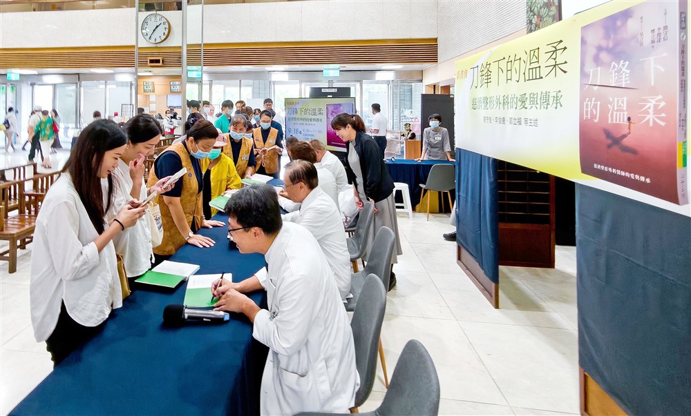 花蓮慈院整形外科主治醫師吳孟熹,是慈濟大學醫學系首屆醫學生,他幽默道出自己臨床經歷加上大學七年也有二十年的慈濟資歷了,可是在座老師們都是三十年以上的前輩,自己還是差了一大截。他譬喻慈濟醫院像是一艘救難船,而整形外科是船上其中一把救生梯,在座的老師都是很強的鉤子,鎮守在救生梯的最上面,用醫術、教學作為強鏈,把這梯子牢牢穩住,「後面才有我們這些蘿蔔頭一個個扣上去,連成一串。每年這樣在慈濟醫院訓練下來,沒有一個漏失掉,這麼多年來,大家一起撐『中央山脈以東』的整形外科醫療,我也與有榮焉。」今天在現場也有一群年輕的外科醫師、專科護理師、護理師,歡歡喜喜專程來參加師長們的新書會、合影紀念。會後還有幾位病友前來簽書,溫馨感人。