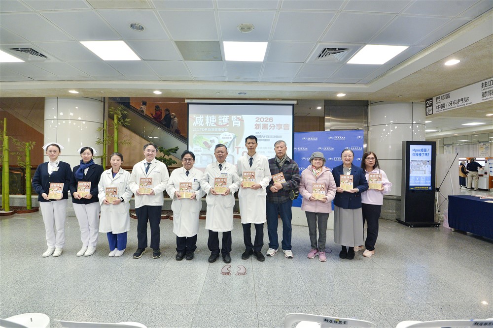 台北慈濟醫院於二○二六年一月八日舉辦《減糖護腎211 TOP 蔬食健康餐盤》新書分享會,教病人蔬食遠離糖尿病腎臟病的威脅。左起:門診陳宜君護理長、護理部陳似錦督導、腎臟透析中心黃瑞玲護理長、營養科江政陽副主任、腎臟內科洪思群主任、徐榮源副院長、王奕淳醫師、王醫師父親王煌雄老師、母親楊惠娜老師、醫療法人人文傳播室曾慶方主任、原水文化陳玉春主編。