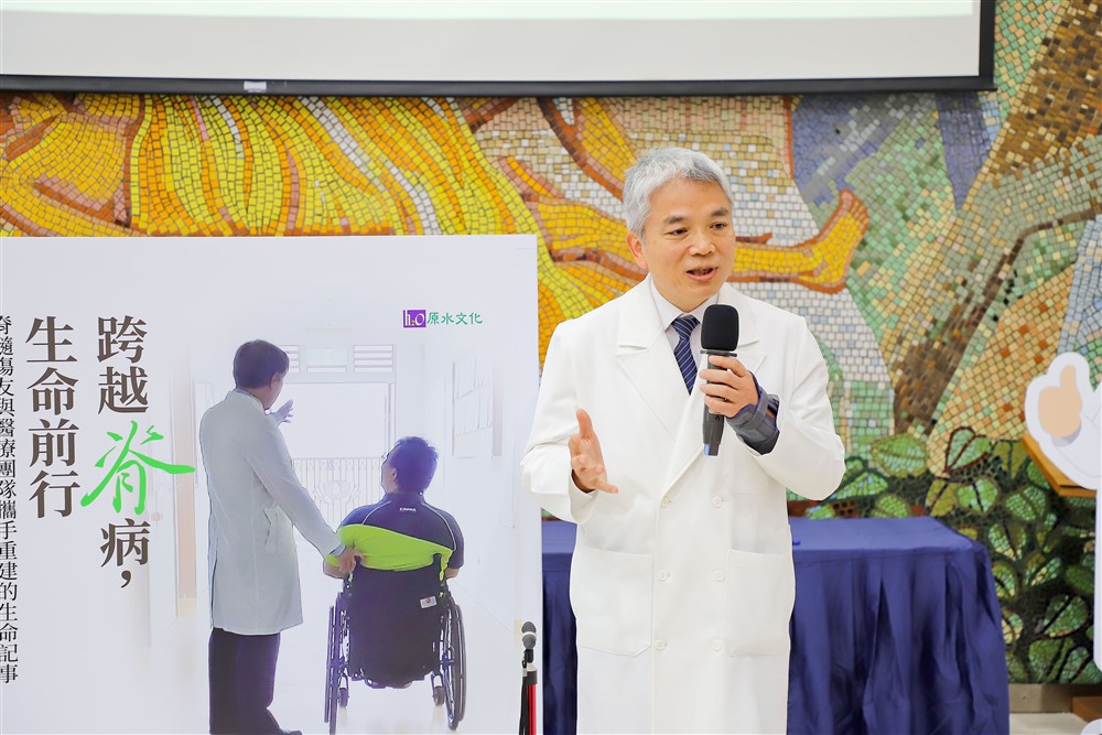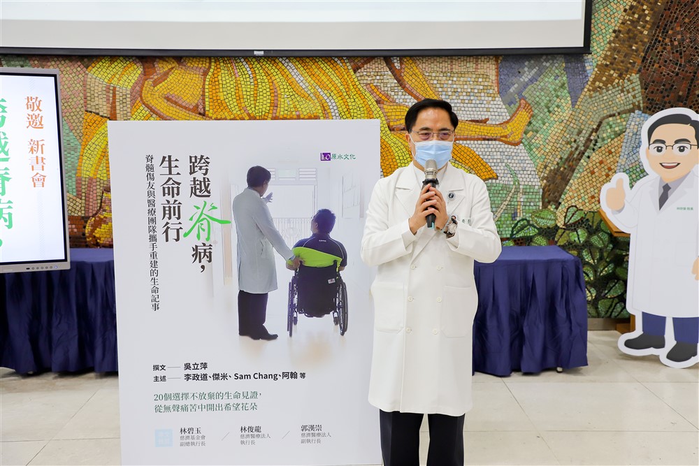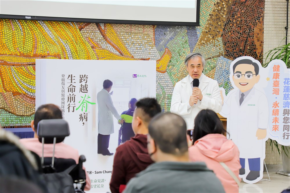 花蓮慈院林欣榮院長感恩郭副執行長帶領團隊出版這本新書,他提到,證嚴法師因對脊損傷友不捨,三十多年前成立了「脊髓損傷醫療重建基金專戶」,提供傷友醫療補助、急難救助、職業訓練等,盼以醫療結合慈善,讓傷友得到更完善的照顧。因為今天神經外科蔡昇宗主任開刀,由他來分享,花蓮慈院的神經重建,有骨科、神經外科來協助處理,近年來神經外科隨著自體骨髓間質幹細胞移植、脊髓晶片電極電刺激等創新療法,以及針對傷友個別設計的中西醫復健療程,協助更多傷友突破身體限制,甚至有傷友恢復到能站、能走。像是今天也來到現場的個案管理師傑米,去年他因車禍重傷,受傷後不能動、沒有知覺、大小便失禁,經過神經外科、泌尿科的努力後,他站起來了,發願要幫助其他脊損傷友,現在也是脊髓重建團隊的個案管理師。