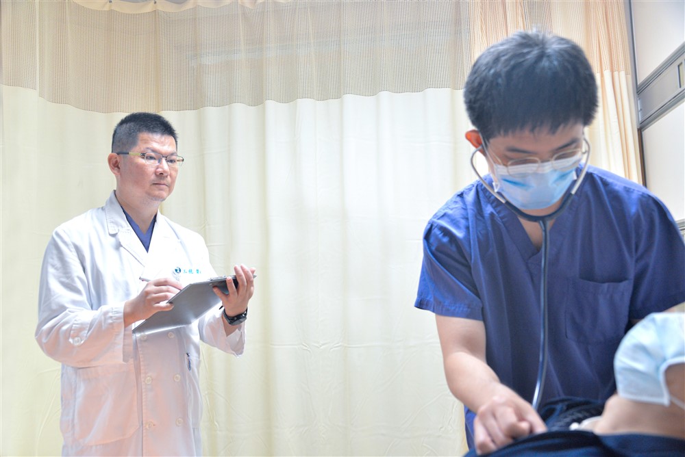 台北慈濟醫院急診部以EPAs 評核住院醫師的執行能力,即住院醫師操作時,由主治醫師在一旁評估熟練度,左為陳玉龍醫師。