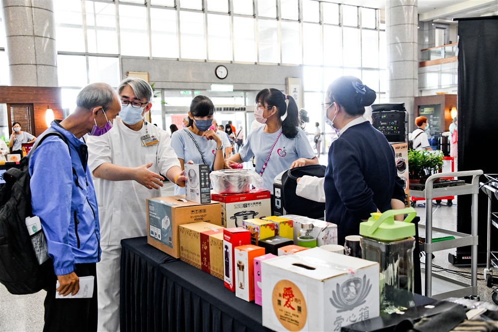 十四日一早醫院大廳就熱鬧滾滾,由北港日興堂、斗南真品麵線糊、大愛幼兒園、悅昇貿易有限公司、大林慈院悠活布藝手作社、慈濟高雄線上讀書會針線情串聯愛、護理部及志工團隊等攤位,熱情響應「點亮微光 讓愛飛揚」大愛共善義賣園遊會,吸引不少同仁、民眾前來共襄盛舉。