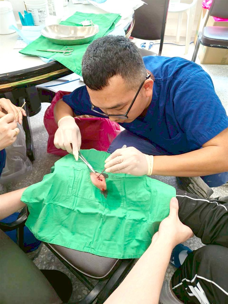 花蓮慈院骨科陳林睦醫師在醫療站現場蹲著為傷患縫合傷口。