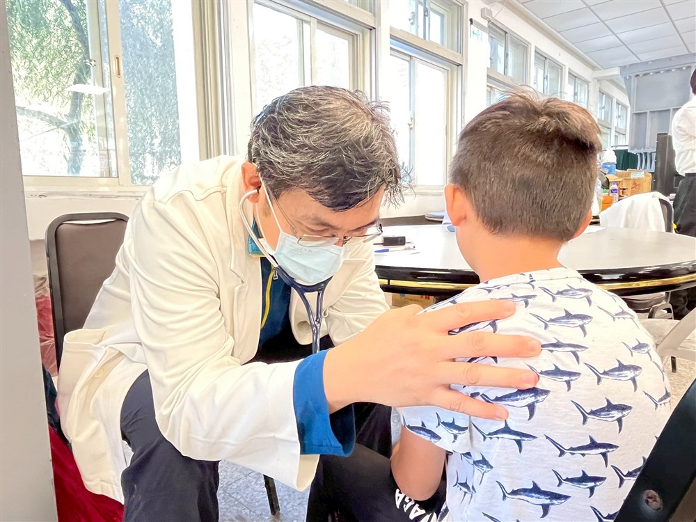 災區現場除了內科及外科需求,花蓮慈院醫療隊也包含中醫、兒科、老年醫學科、感染科與精神科。圖為花蓮慈院小兒部張雲傑醫師為小朋友細心聽診。