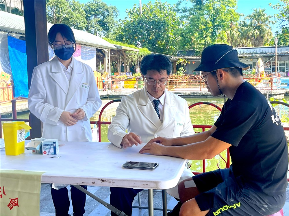 七十多歲的徐阿嬤在撤離時不慎被暴漲泥水沖走,幸好緊急救回,阿嬤不只受到驚嚇,身體還有多處疼痛。許文林顧問為她開立止痛藥物及痠痛貼布緩解傷痛,並親切安撫。