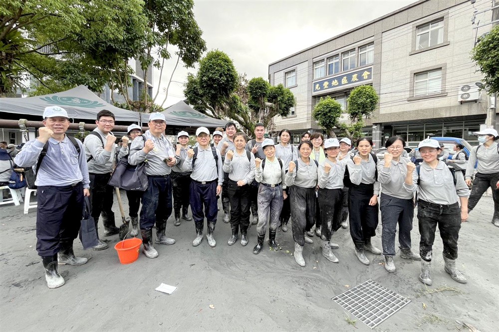 台中慈院簡守信院長(左四)與院內同仁前往光復災區救災,除了提供急需的醫療服務,更與志工並肩協力清除淤泥。