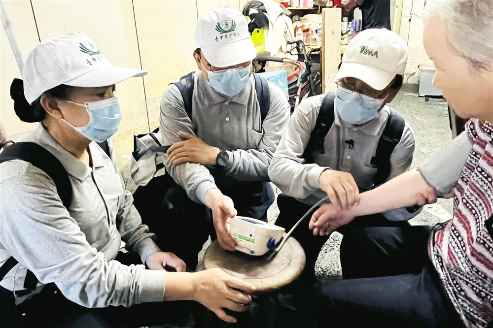 台中慈院團隊走進災民家中,為鄉親長者提供醫療服務。右起為簡守信院長、林英超醫務祕書、莊淑婷副院長。