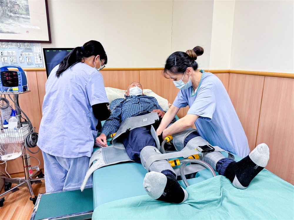 EECP 治療過程中,心臟外科主任余榮敏(左一)持續監測病人生命徵象,依實際狀況調整治療參數,提升整體療效與安全性。