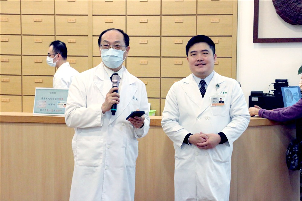 葉家舟院長(左)在候診區為民眾介紹耳鼻喉科駐診醫師李致宇(右)。